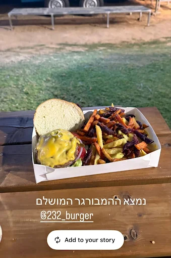 עגלה 232 – עגלת בורגר באשכול, בורגר במועצה אזורית אשכולהמבורגר באשכול: מהלב של עוטף עזה בלב קיבוץ מגן, סמוך לדרך 232, ניצבת “עגלה 232” עגלת המבורגר שהוקמה מתוך תשוקה לאוכל טוב ורצון עמוק להחיות את הדרום ולחזק את הקהילה, בעקבות אירועי 7 באוקטובר.