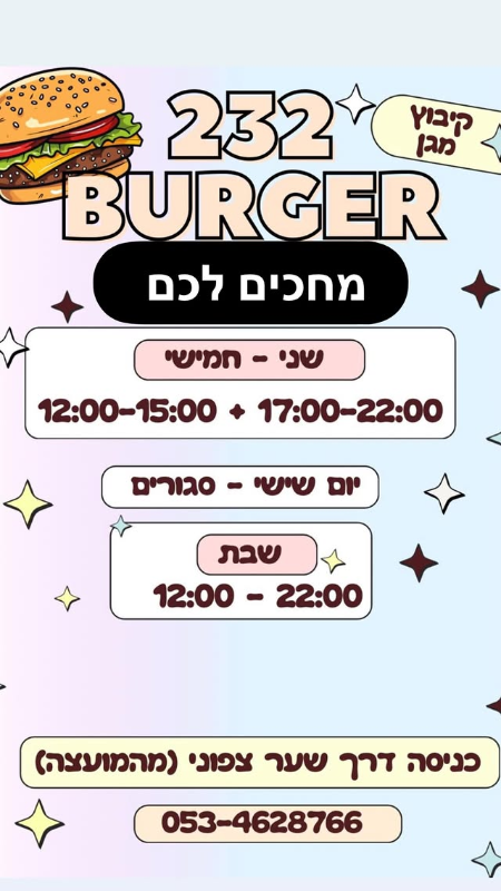 מוזמנים אלינו בורגר 232 קיבוץ מגןבתקופת דרום אדום אנו פתוחים בימי שישי 12:00 – 16:00